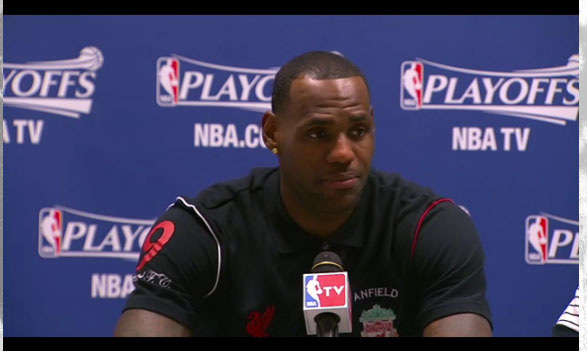 Lebron James, einn besti körfuboltamaður í heimi, vakti athygli þegar hann mætti í Liverpool bol á fréttamannafund eftir að lið hans Miami Heat sigraði Boston 99-90 í úrslitakeppni NBA í kvöld.