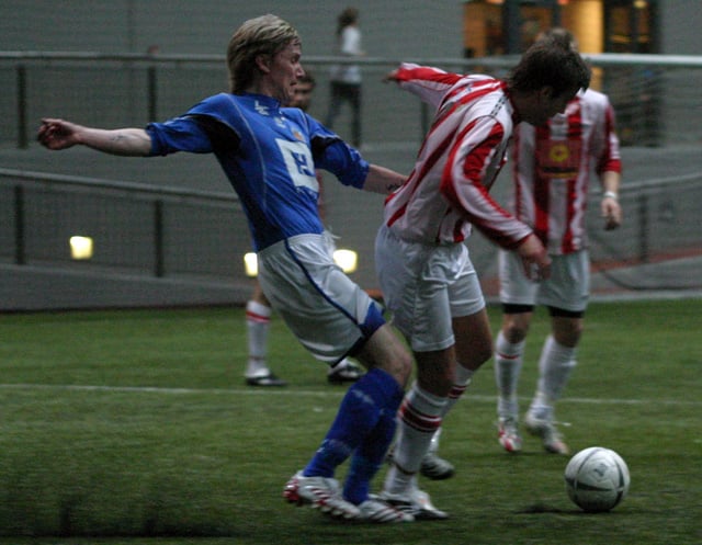 Heiðar Geir Júlíusson (til hægri) skoraði eina markið í kvöld og hér sækir hann að Halli Hallssyni í leiknum.