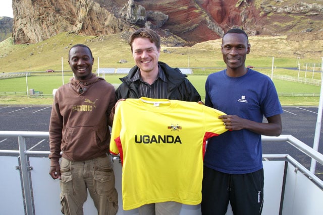 Agustine Nsumba (.t.v) og Andrew Mwesigwa (t.h) ásamt Sigursveini Þórðarssyni formanni knattspyrnudeildar ÍBV eftir að samningurinn var undirritaður.