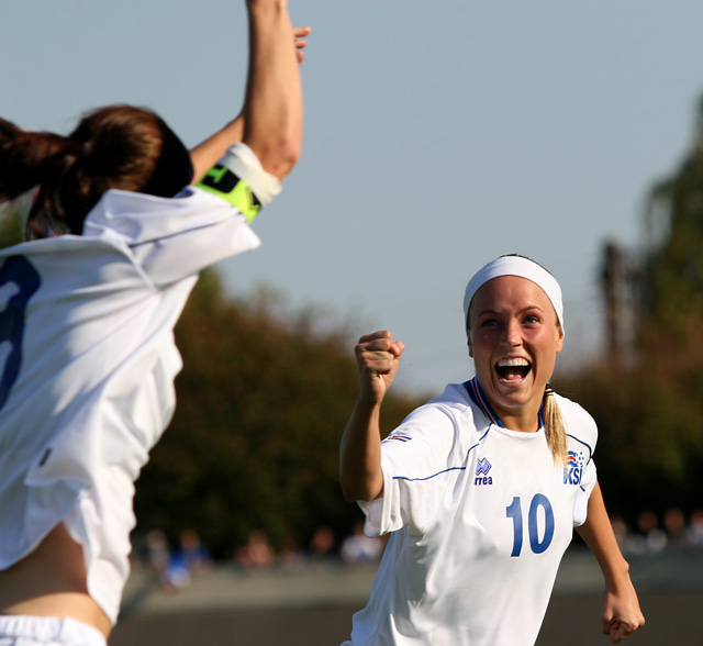 Ekki náðu þó íslensku stúlkurnar að fagna lengi því á 50. mínútu og tveim mínútum á eftir íslenska markinu skorar Candie Herbert eftir mikinn barning í íslensku vörninni með mikilli baráttu, 2-1 og Ísland komið í umspil.