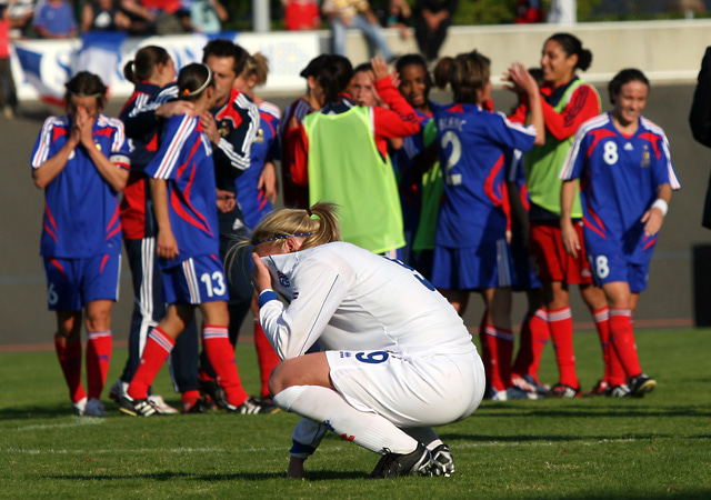 Leikurinn í dag byrjaði af fullum krafti. Franska liðið mætti greinilega ákveðið til leiks og var það á 6. mínútu að Elodie Thomis fékk góða sendingu inn fyrir og vann horn. Hornspyrna tekin og kýldi Þóra Helgadóttir boltanum frá marki og út á vinstri kant. Þaðan kom sending út beint á Sandrine Soubeyrand sem var algjörlega alein og ódekkuð og skoraði glæsilegt mark af 30 metra færi, óverjandi fyrir Þóru Helgadóttur markvörð, 1-0.