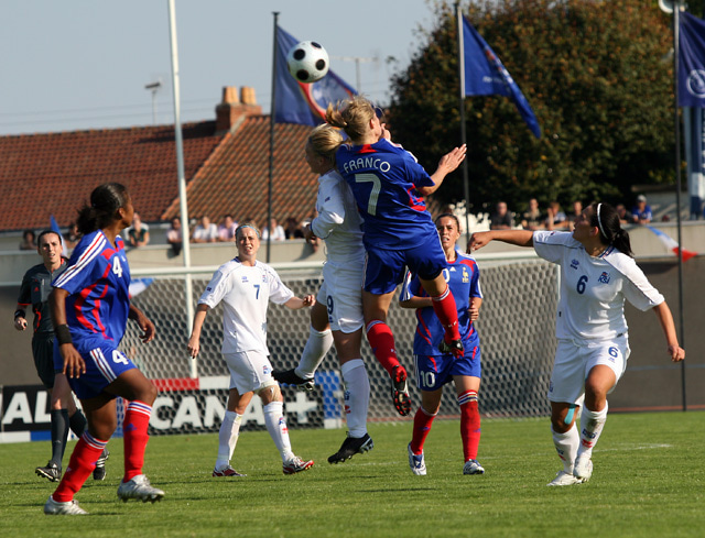 Á 36. mínútu vann Sara Gunnarsdóttir boltann, Hólmfríður Magnúsdóttir náði boltanum og á gott skot yfir markið. Frakkar snúa vörn í sókn og á Louisa Necib stórglæsilega sendingu frá vinstri kanti yfir á hægri til Elodie Thomis. Elodie Thomis sendir boltann fyrir og eftir nokkurn barning í vörn íslenska liðsins nær Þóra Helgadóttir að verja glæsilega.