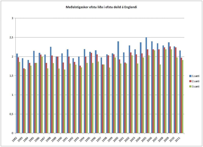 Skoðum aðeins hvað hefur þurft í gegnum tíðina til að vinna deildina. Meðfylgjandi súlurit (til hliðar) sýnir stigafjölda þriggja efstu liða í deildinni síðan 3 stiga reglan var tekin upp árið 1982. Þar sem ekki voru alltaf leiknar 38 umferðir (og yfirstandandi tímabili ekki lokið) er þetta sett fram sem stig per leik svo hægt sé að bera þetta saman.