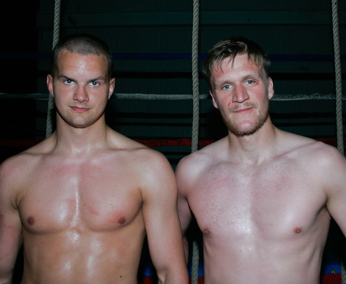 Kolbeinn og Grétar Sigfinnur eftir bardagann. Hægt er að sjá myndina stærri með því að smella á hana en eins og sést er Grétar Sigfinnur skorinn í andliti.