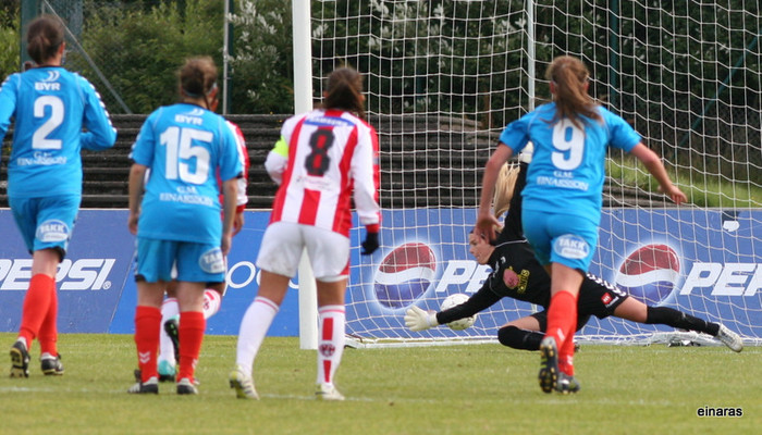 „Hann sagði að hún hefði togað aftan í hana. Ég sá það ekki nógu vel sjálf en það verður bara að hafa það. Hann ætlaði fyrst að dæma aukaspyrnu en svo sagði línuvörðurinn að þetta væri víti.“