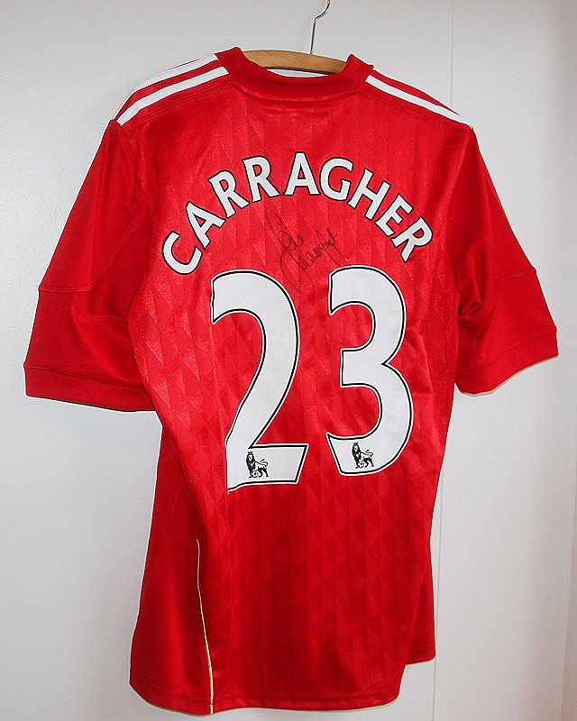 Fótboltaáhugakonan Hanna Símonardóttir hefur tekið ákvörðun um að gefa áritaða treyju frá Jamie Carragher varnarmanni Liverpool.
