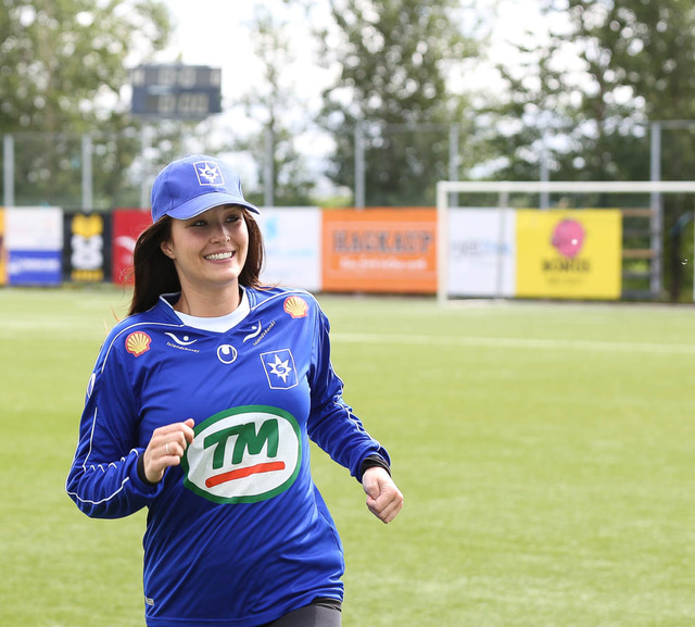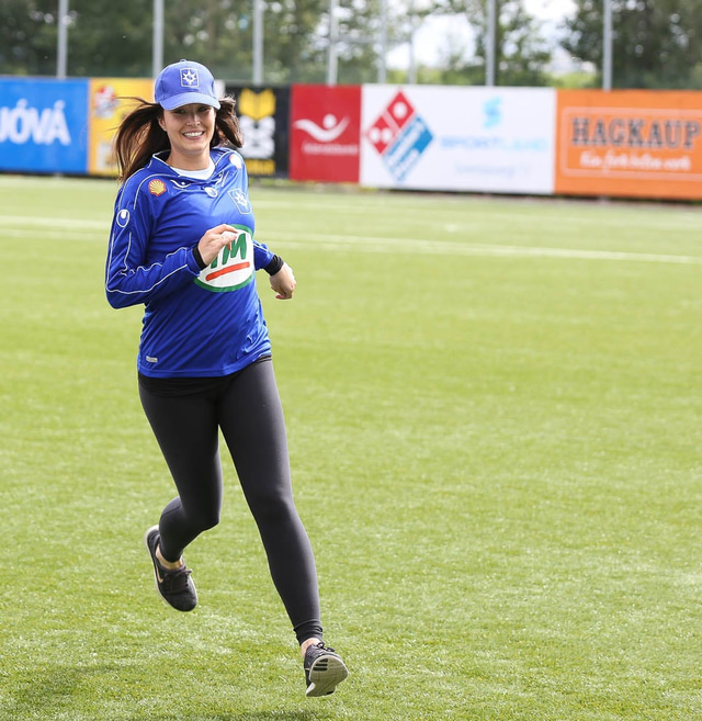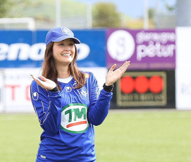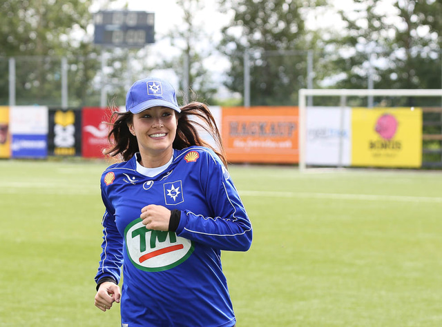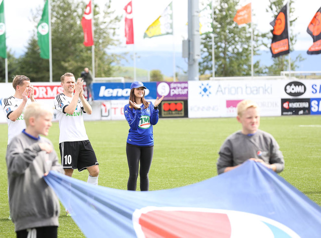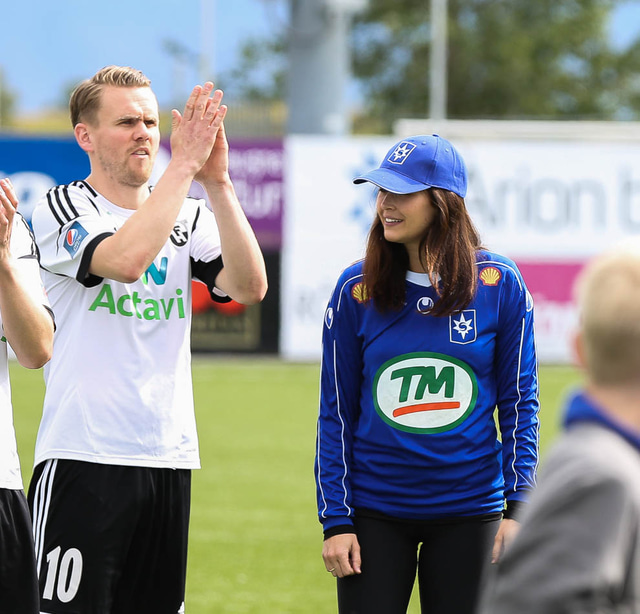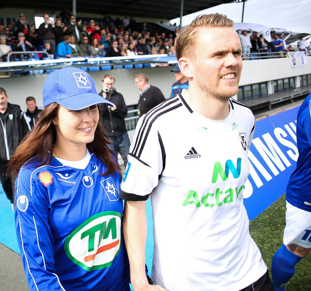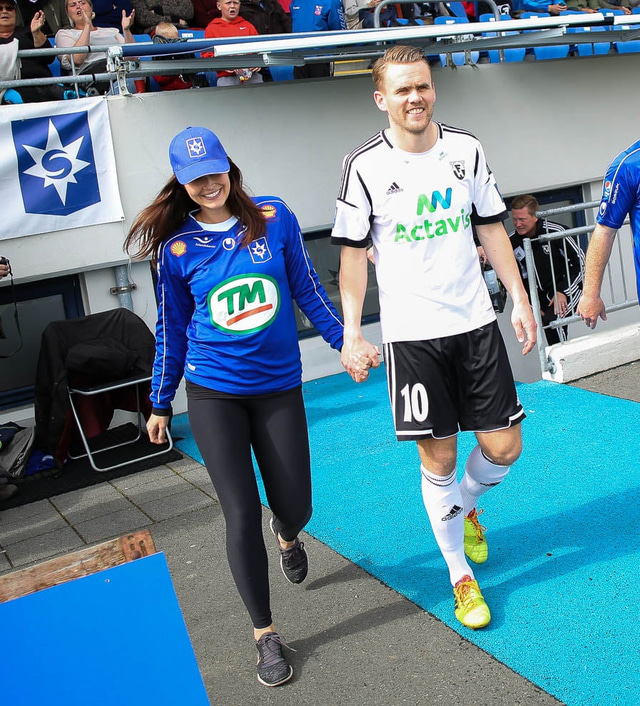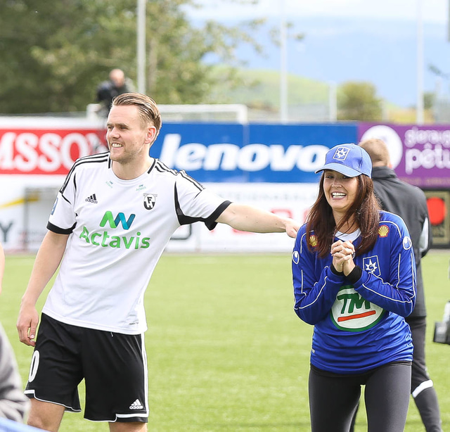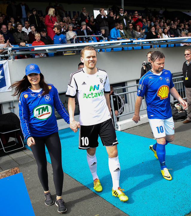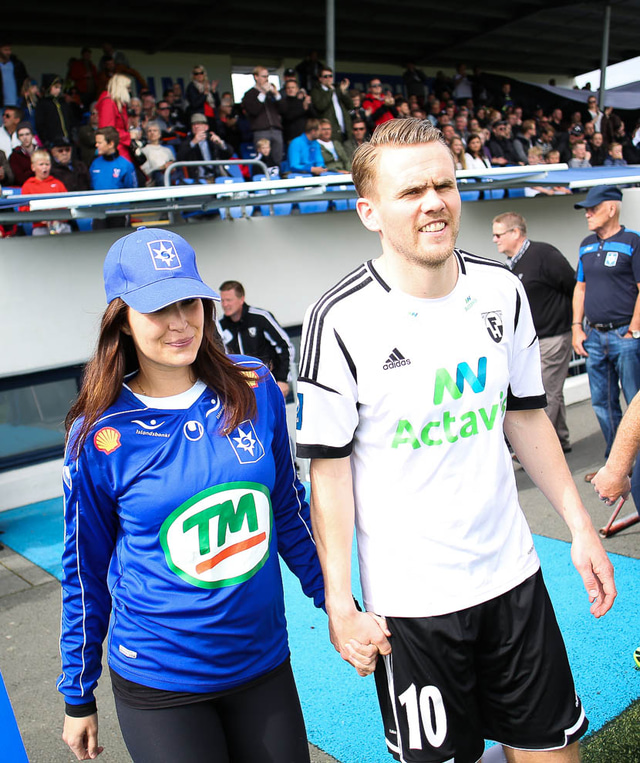 Unnur Birna Vilhjálmsdóttir sem var kjörin ungfrú heimur árið 2005 gekk með Davíð Þór Viðarssyni leikmanni FH inn á Stjörnuvöll þegar liðin mættust í Pepsi-deild karla í gær.