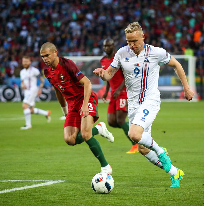 Kolbeinn Sigþórsson fór gjörsamlega á kostum í loftinu í leik Portúgals og Íslands í kvöld.