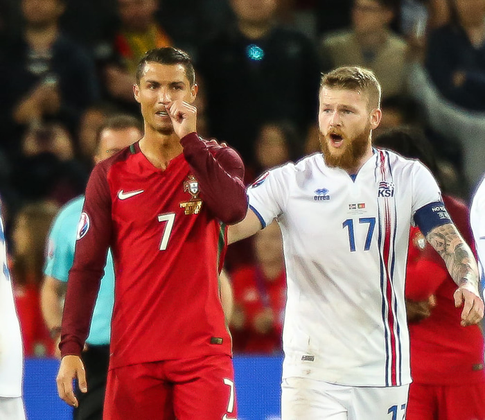 Fyrirliðinn, Aron Einar Gunnarsson og Cristiano Ronaldo áttu margar barátturnar í leiknum og virtist Akureyringurinn komast undir skinnið hjá stórstjörnunni.