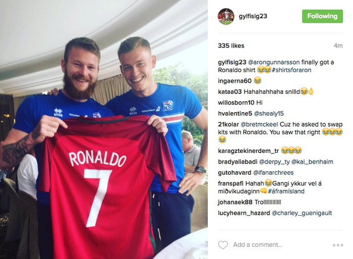„@arongunnarsson, fékk loksins Ronaldo treyju," sagð Gylfi Þór Sigurðsson á Instagram.