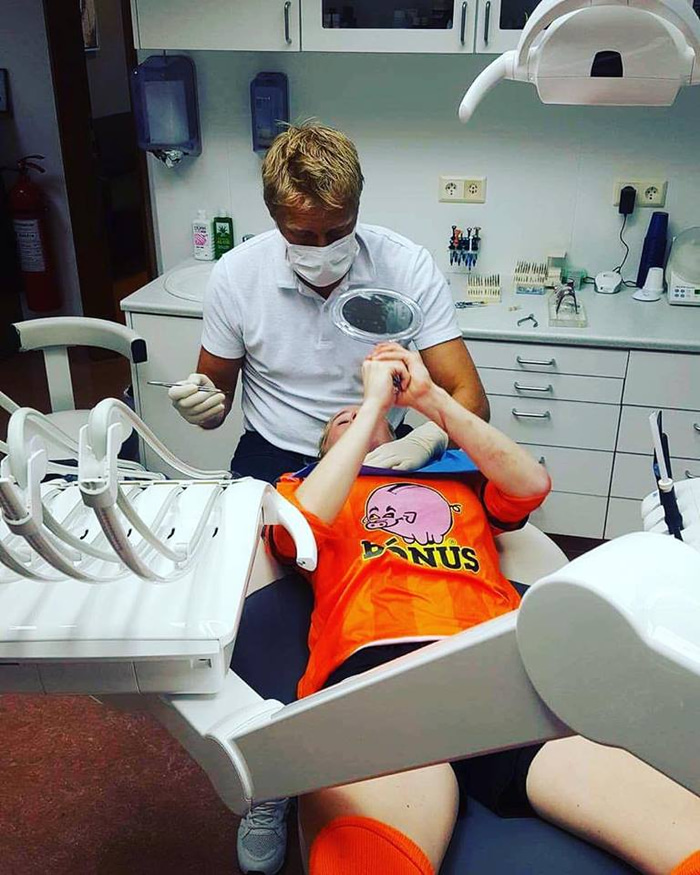 „Hér erum við Heimir að fara yfir hvernig framtönnin passar best í eftir að hafa dottið úr í heilu lagi (skrýtnasta sem ég hef séð) í miðjum fótboltaleik í Eyjum. Aaaansi heppin að hann var á staðnum 🙌 Tönnin komin í svo eeengar áhyggjur af mér."