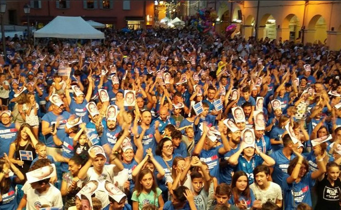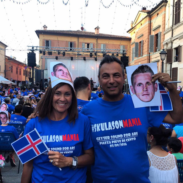 Víkingahjálmar, Víkingaklöpp og bolir og treyjur merktar Ara Frey Skúlasyni og númeri hans, 23, voru áberandi í bænum Pieve di Cento í Bologna í gær.