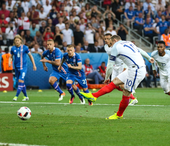 Byrjunin var ekki góð því Wayne Rooney skoraði strax á fjórðu mínútu fyrir England. Hannes Þór Halldórsson braut á Raheem Sterling og Damir Skomina frá Slóveníu dæmdi vítaspyrnu sem Rooney skoraði úr.