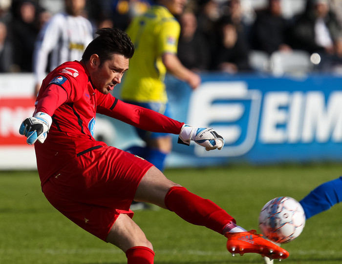 Markvörðurinn öflugi Kristijan Jajalo er maðurinn á bakvið miðann á veggnum í klefanum en Grindvíkingar hafa komið öllum á óvart með frammistöðu sinni í sumar.