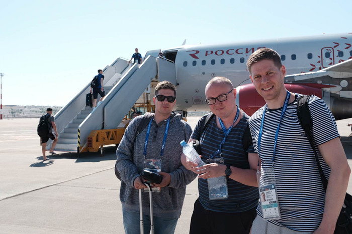 Tómas Þór Þórðarson spjallaði við Elvar Geir Magnússon og Magnús Má Einarsson á flugvellinum í Gelendzhik áður en flogið var yfir til Moskvu.