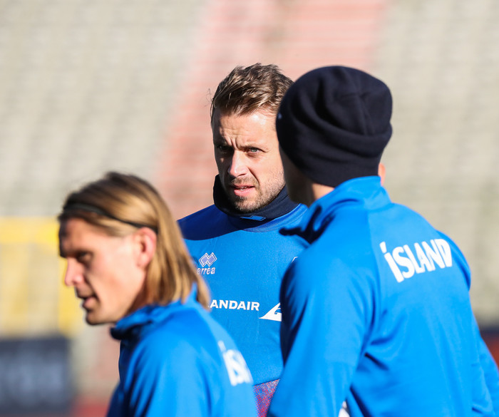 Kári Árnason var valinn maður leiksins í 2-0 tapinu gegn Belgíu síðasta fimmtudag en annað kvöld verður hann með fyrirliðabandið þegar Ísland mætir Katar í Eupen.