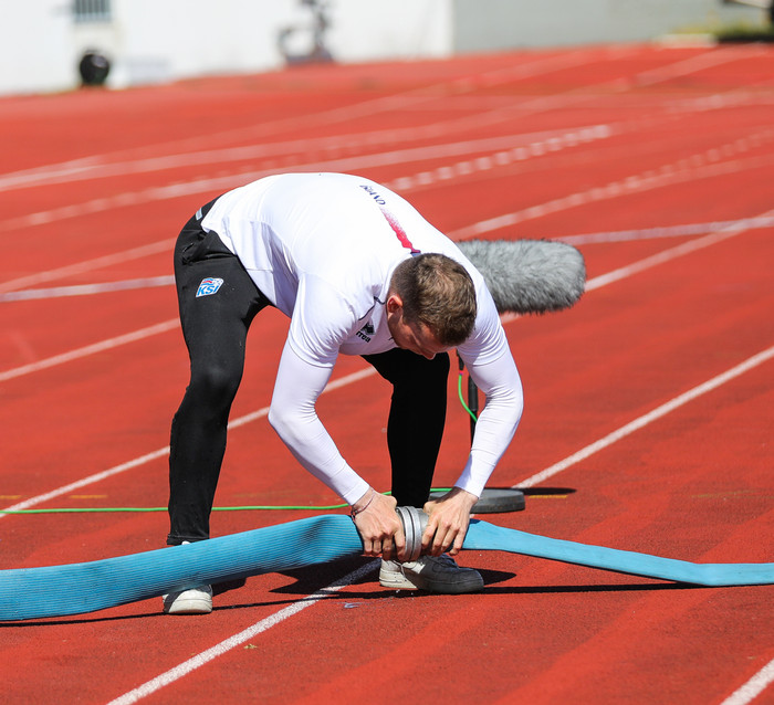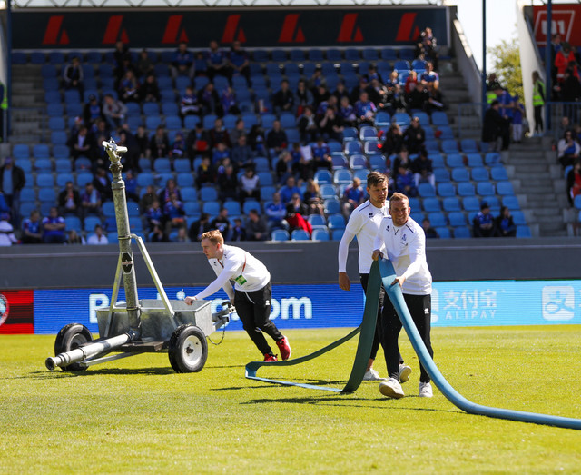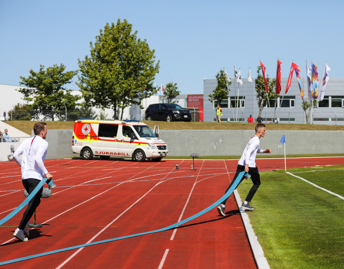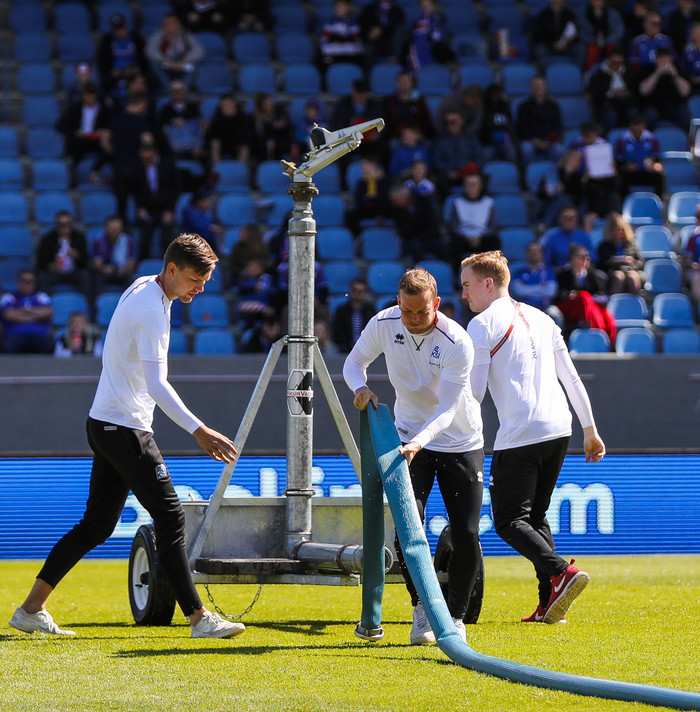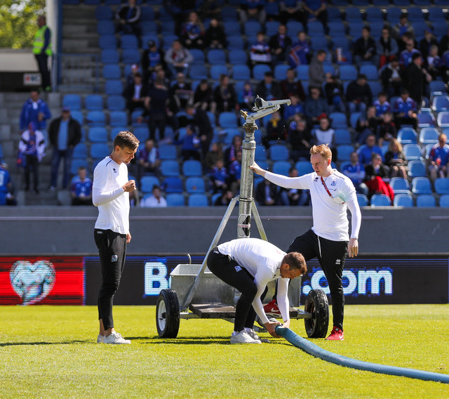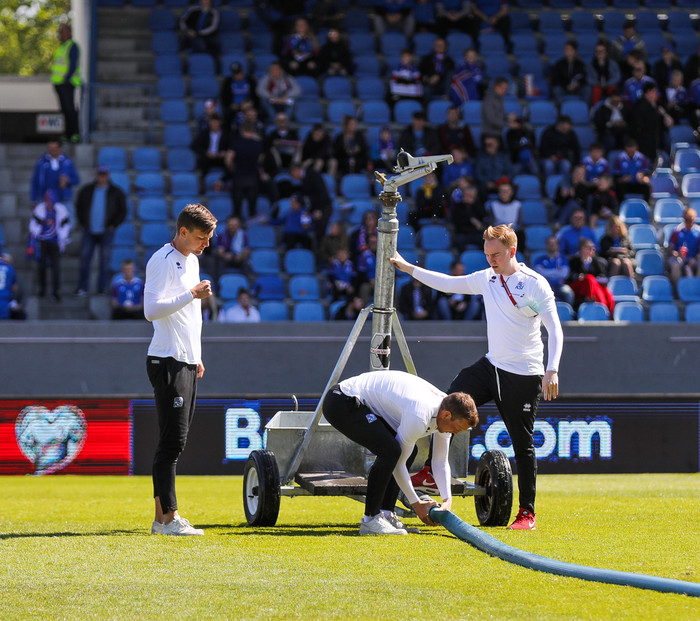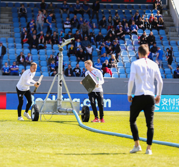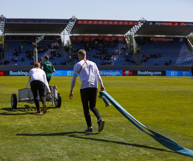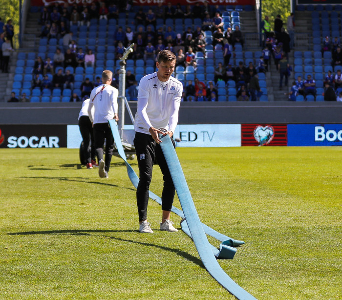 Bjarki Már er í sumarstarfi á Laugardalsvelli á meðan það er frí í fótboltanum í Katar.