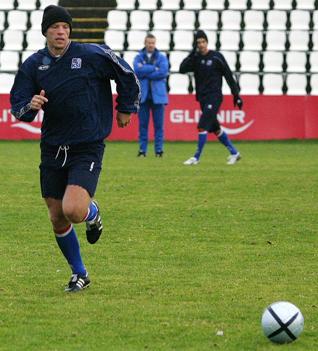 Eiður Smári skoraði þrjú á æfingu hjá Barcelona.  Hér er hann á æfingu með íslenska landsliðinu í Kaplakrika.