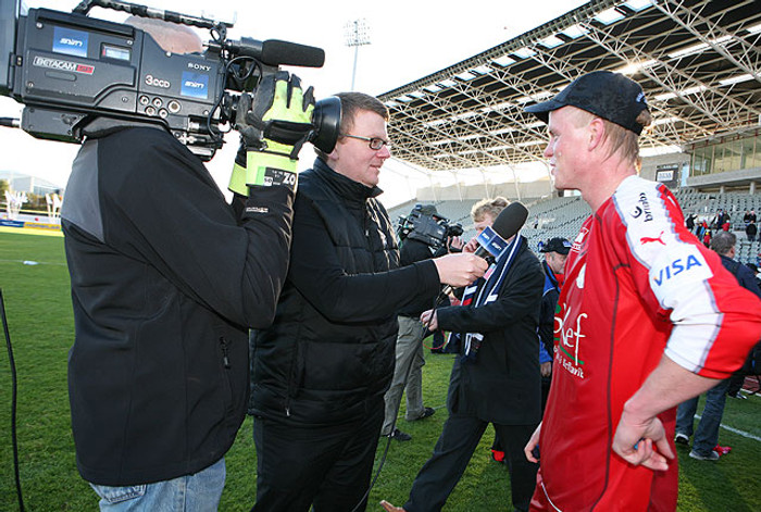 Sjónvarpsstöðin Sýn mun hafa beinar útsendingar úr fjölda leikja Landsbankadeildarinnar í sumar. Hér er Hörður Magnússon íþróttafréttamaður stöðvarinnar með Baldur Sigurðsson leikmann Keflavíkur í viðtali.
