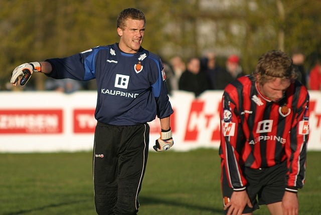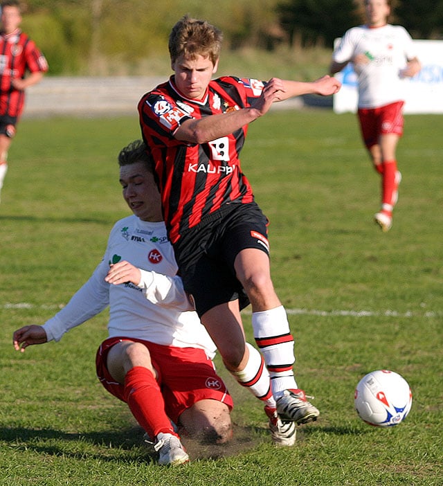 HK áttu svo aftur dauðafæri og var þar að verka Svisslendingurinn Oliver Jaeger. Hann gerði vel í að kasta sér fram á fyrirgjöf frá vinstri en bylmingsfastur skalli hans fór í slánna og út þar sem Þórður Birgisson gerði tilraun til bakfallsspyrnu sem fór langt framhjá.