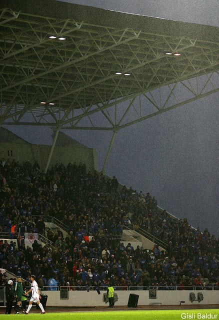 Á þessari mynd sést greinilega hversu opin stúkan er fyrir veðri og vindum. Myndin er tekin í norðurendanum á leik Íslands og Spánar af sætum sem voru hluti af stækkuninni en þarna fær stuðningsmannaklúbburinn úthlutað sætum frá KSÍ.