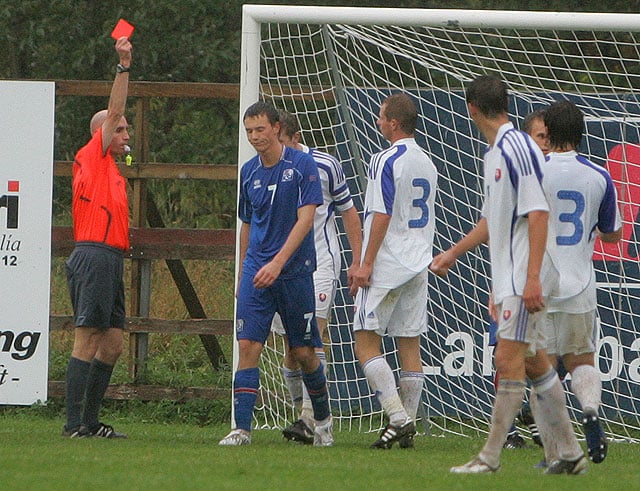 Dómari leiksins dæmdi vítaspyrnu og vísaði Eggerti af velli fyrir brotið. Úr spyrnunni skoruðu svo gestirnir örugglega framhjá Þórði Ingasyni í marki Íslands.