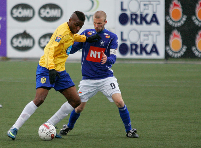 Gilles Mbang Ondo var hetja Grindvíkinga gegn Haukum í kvöld en hann skoraði tvívegis á tveggja mínútna kafla í síðari hálfleik og tryggði liðinu 3-2 sigur í fallbaráttuslag.