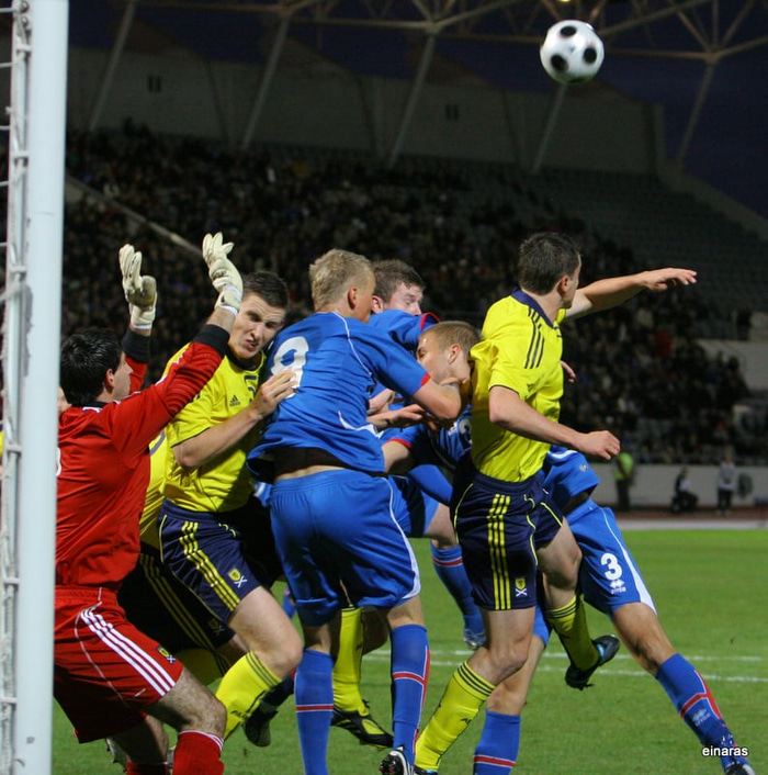 Eftir tæpan tíu mínútna leik fengu Íslendingarnir fyrsta dauðafærið þegar Birkir Bjarnason kom í fyrirgjöf inn í teig sem munaði engu að Bjarni Þór Viðarsson næði að skalla í netið. Boltinn fór hins vegar framhjá honum og varnarmaður Skota skallaði rétt framhjá og í horn.