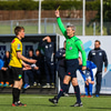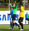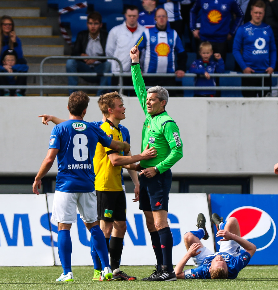 Allt í kringum spjaldið á Albert var einstaklega skrautlegt, fær seinna gula og hleypur svo hlægjandi útaf.