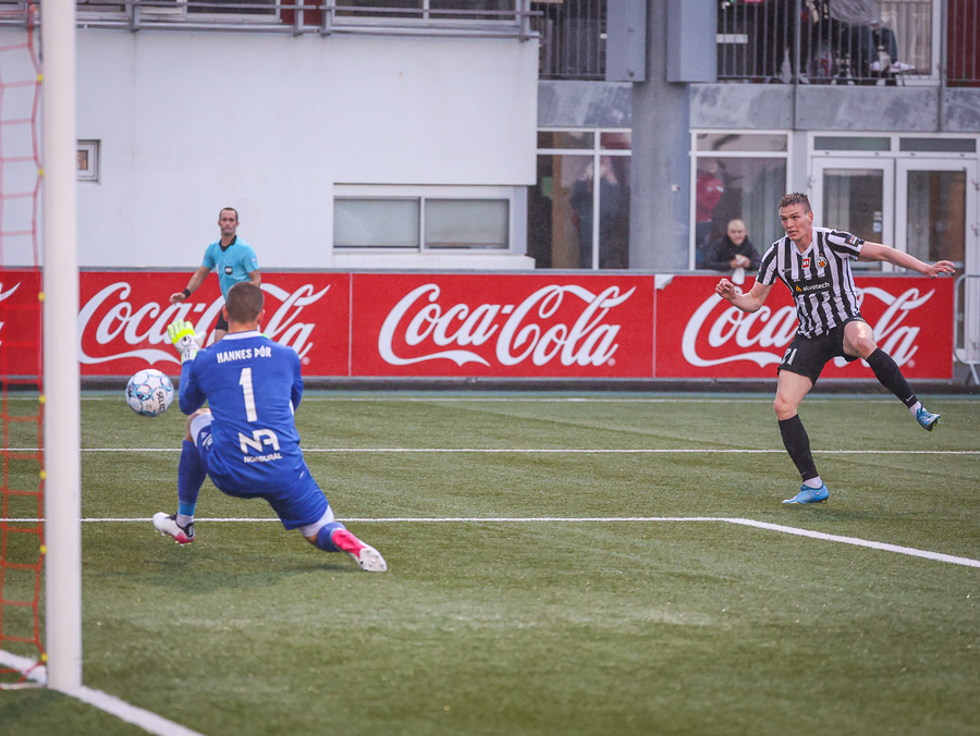 Áður bent á tvöfalda vörslu Hannesar en lykilmóment leiksins er þegar að Kristján Flóki og Kjartan Henry eru skyndilega tveir einir gegn Hannesi í markteignum.