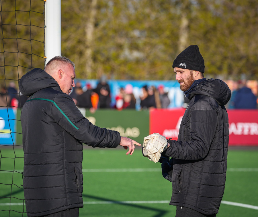 Aðstæður: Sólin skín og gervigrasið rennandi blautt