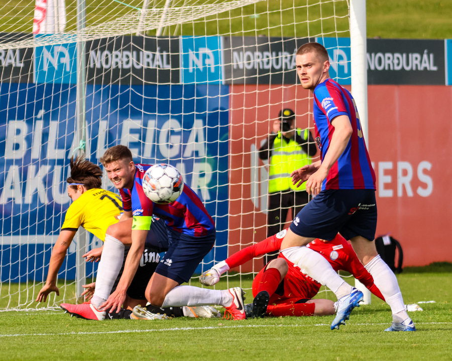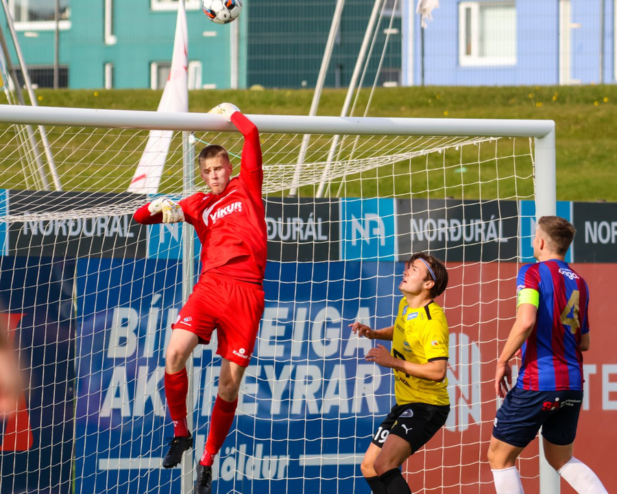 Þeir Tobias Stagaard og Viktor Jónsson urðu fyrir því óláni að setja boltann í sitt eigið net. Þetta er ekki dagur sem þeir vilja sérstaklega muna eftir.