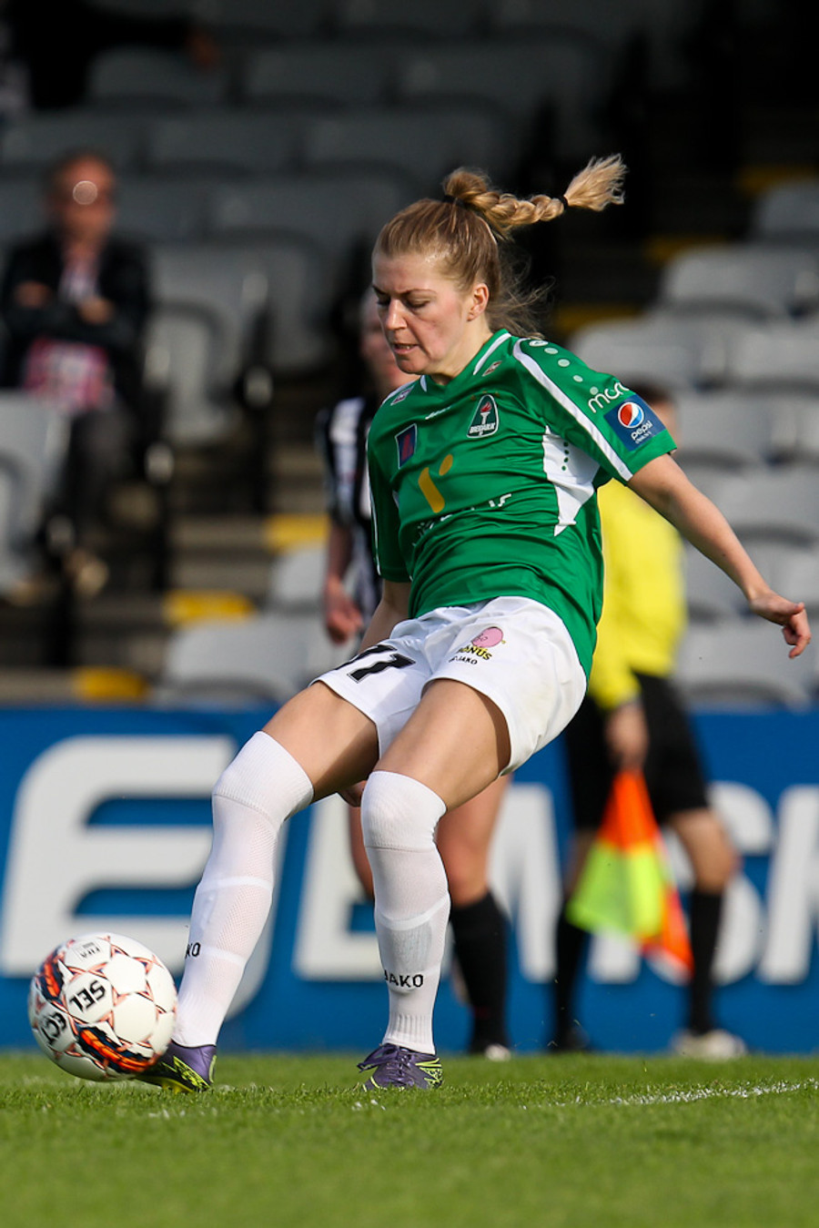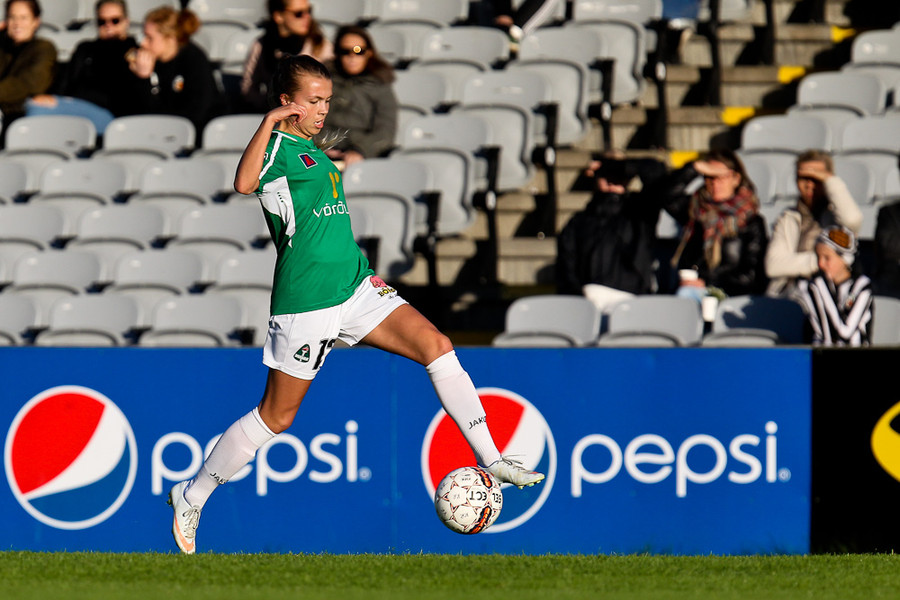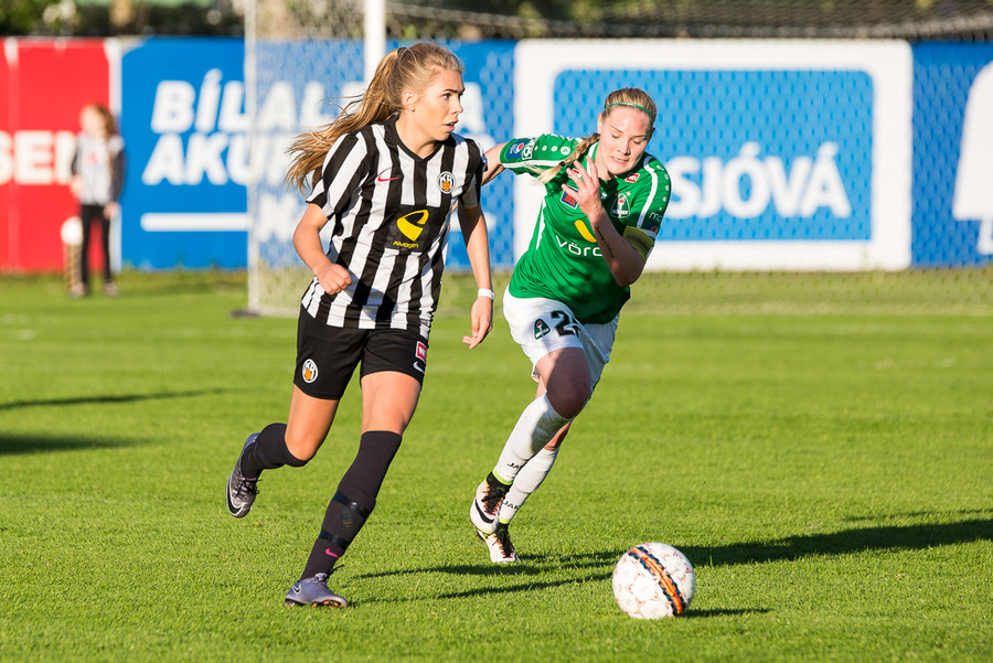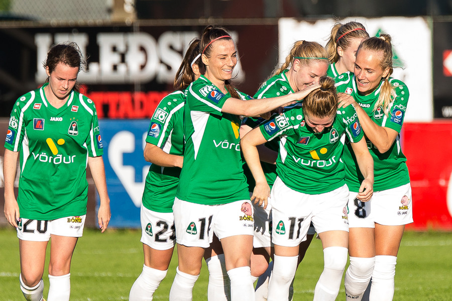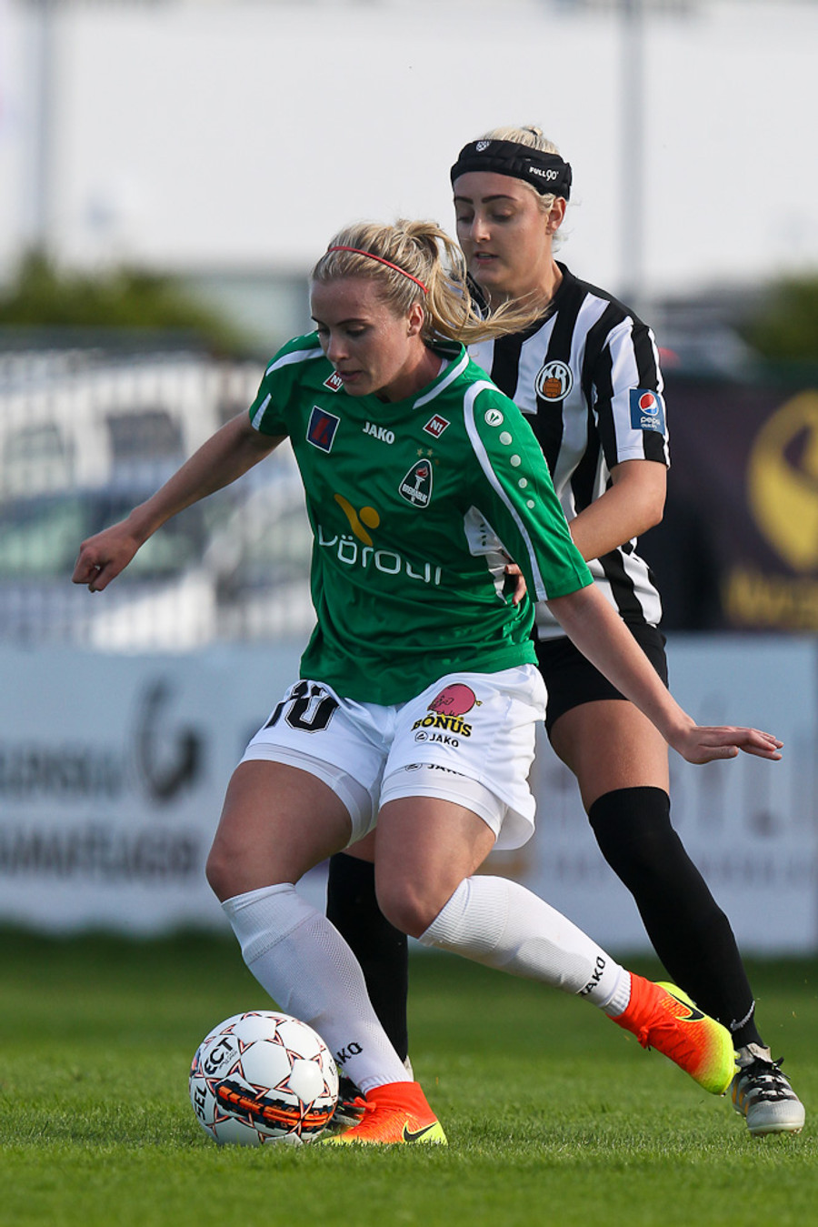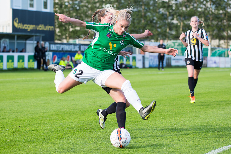 Fyrsta hornspyrna leiksins lítur dagsins ljós. Hallbera með bolta sem svífur yfir teiginn á fjær, en boltinn endar svo í innkasti.