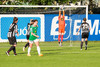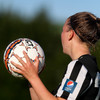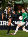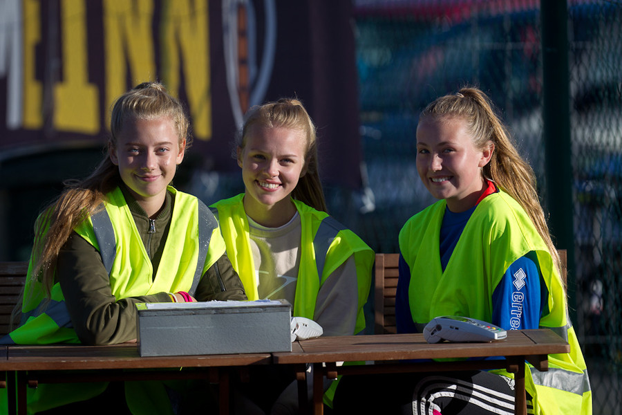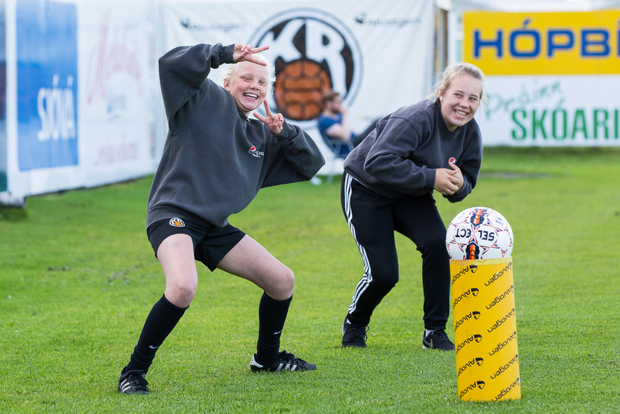 Leikurinn er hafinn og það eru KR-ingar sem byrja með boltann. Þær sækja í áttinni að ísbúðinni.