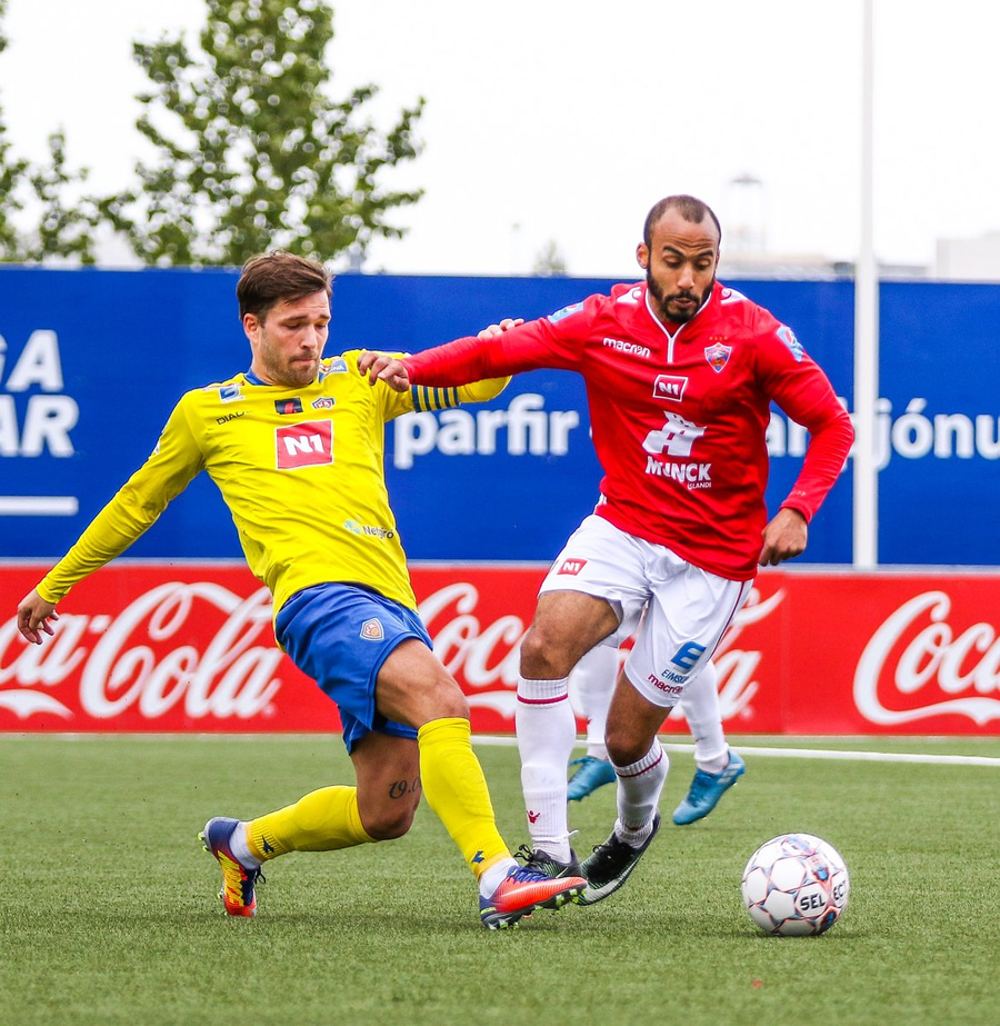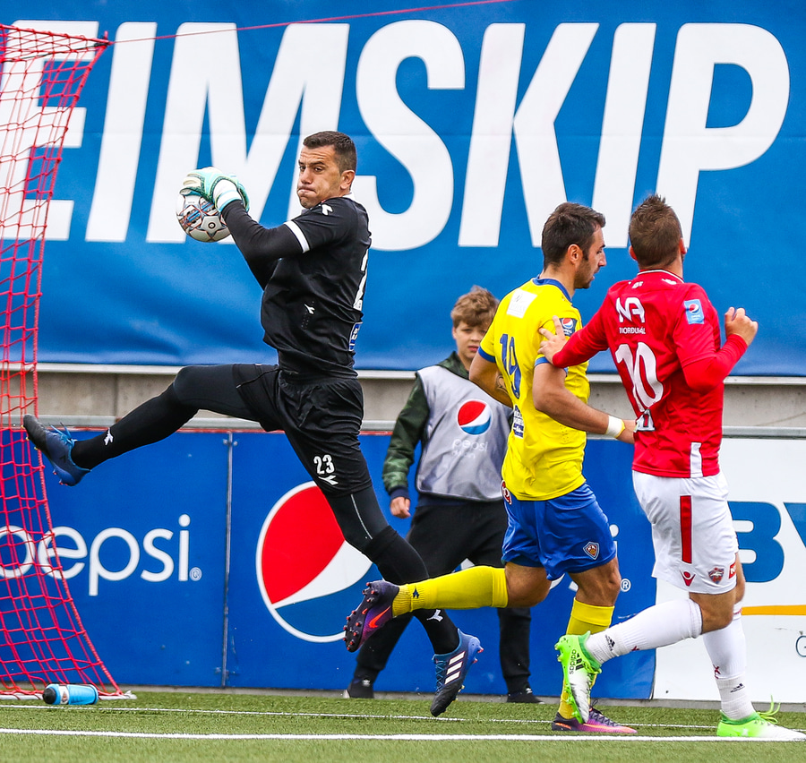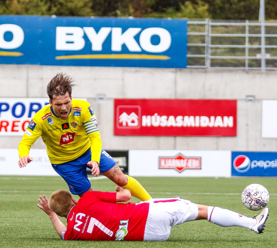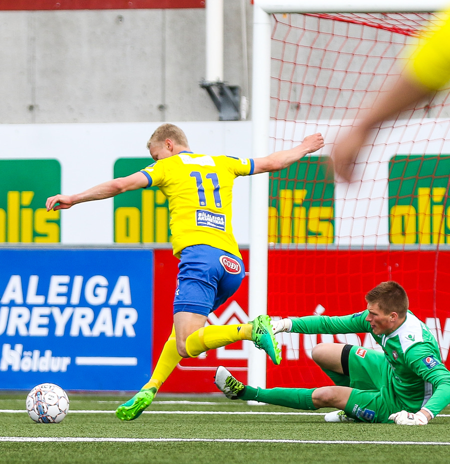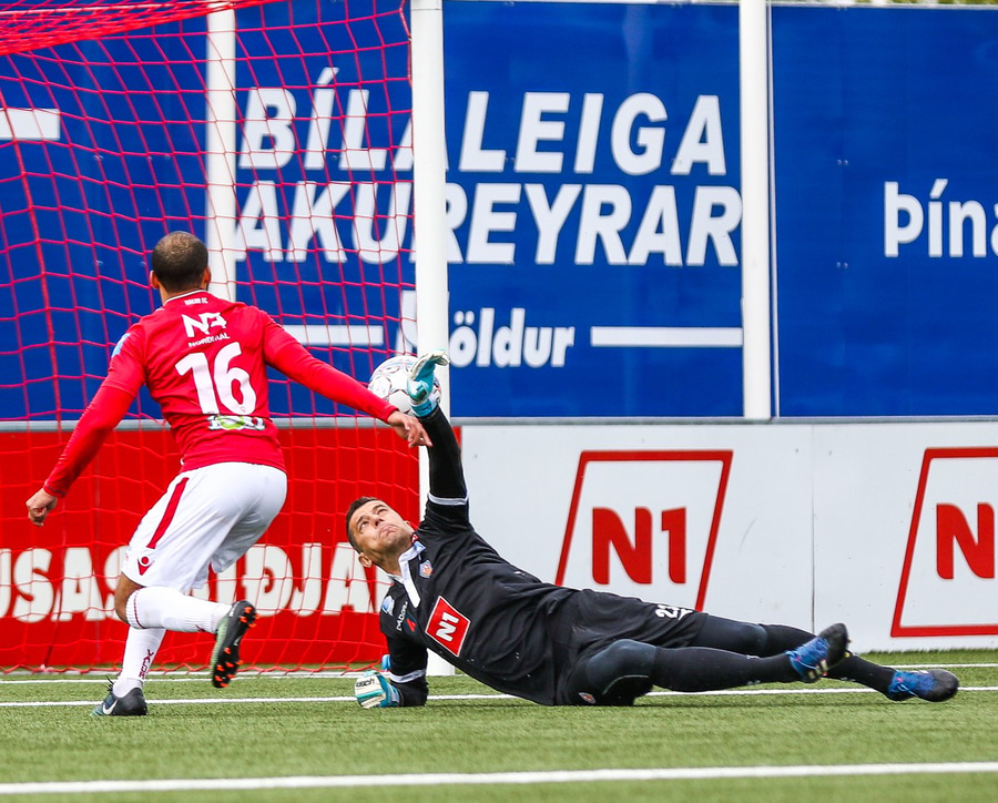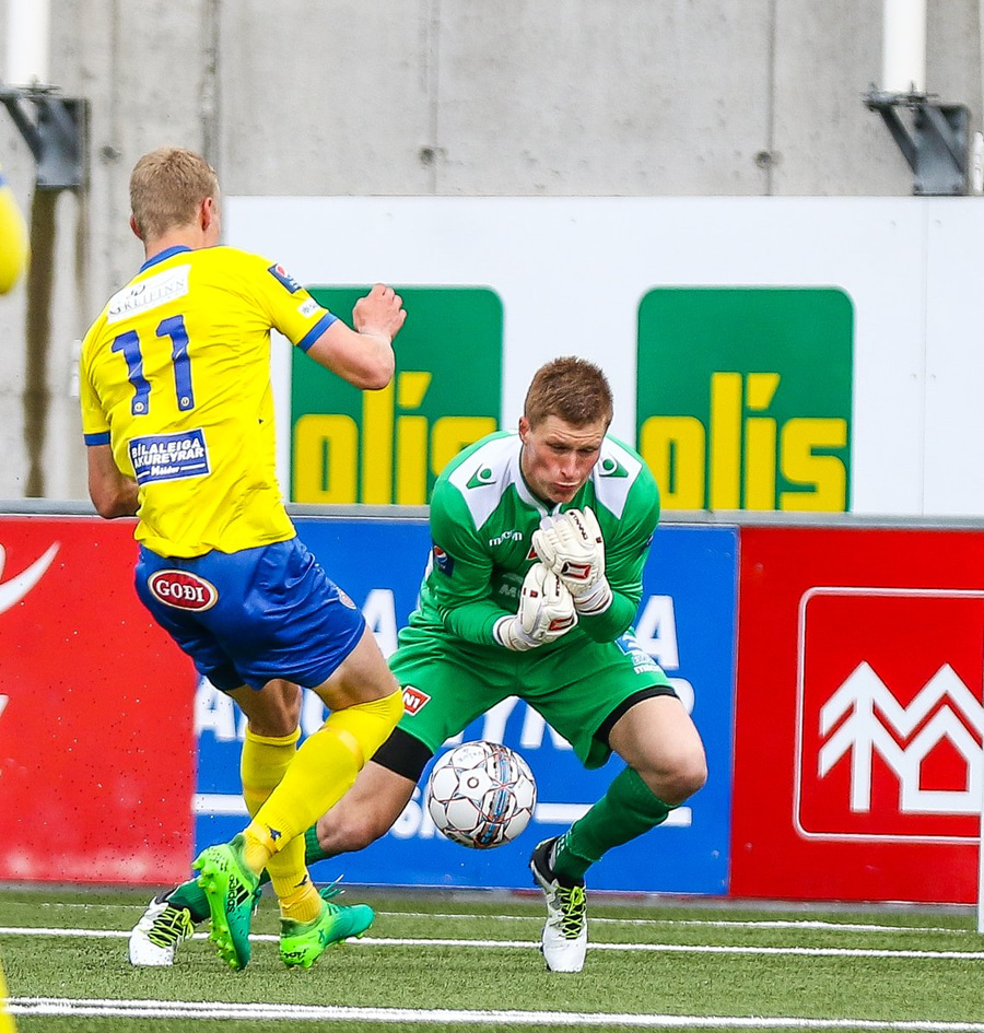 Kristinn Ingi kom sér í þröngt færi eftir að Arnar Sveinn hafði átt góða sendingu inn fyrir. Rajko var þó kominn út í hlaupið og varðist þessu vel.