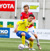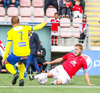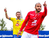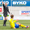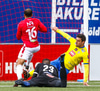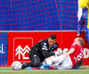 Sigurður Egill með fyrirgjöf frá vinstri og Kristinn Ingi kemst í boltann en fer í Rajko. Markvörðurinn liggur eftir og Kristinn fær gult spjald.