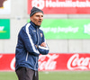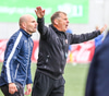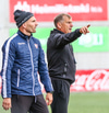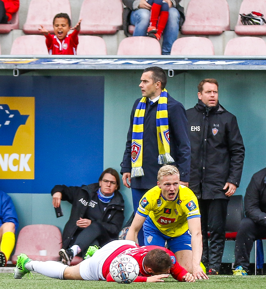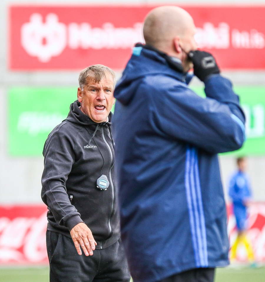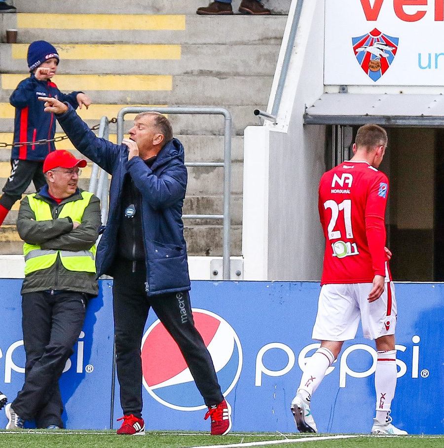 Ólafur Jóhannesson með skemmtileg tilþrif. KA á innkast og Ólafur fékk boltann á hliðarlínunni en hann kastaði honum yfir Trninic að mér sýndist. Óviljaverk segir hann og allt verður vitlaust.