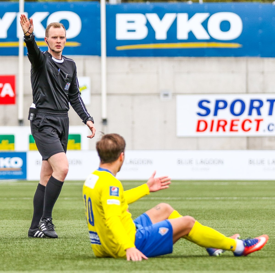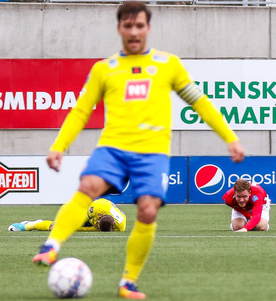 Arnar Sveinn Geirsson liggur eftir á vellinum. Það eru nokkrir sérfróðir menn sem kalla þetta leikaraskap og töf á leiknum. Ég veit ekki hvernig ég á að bregðast við því.