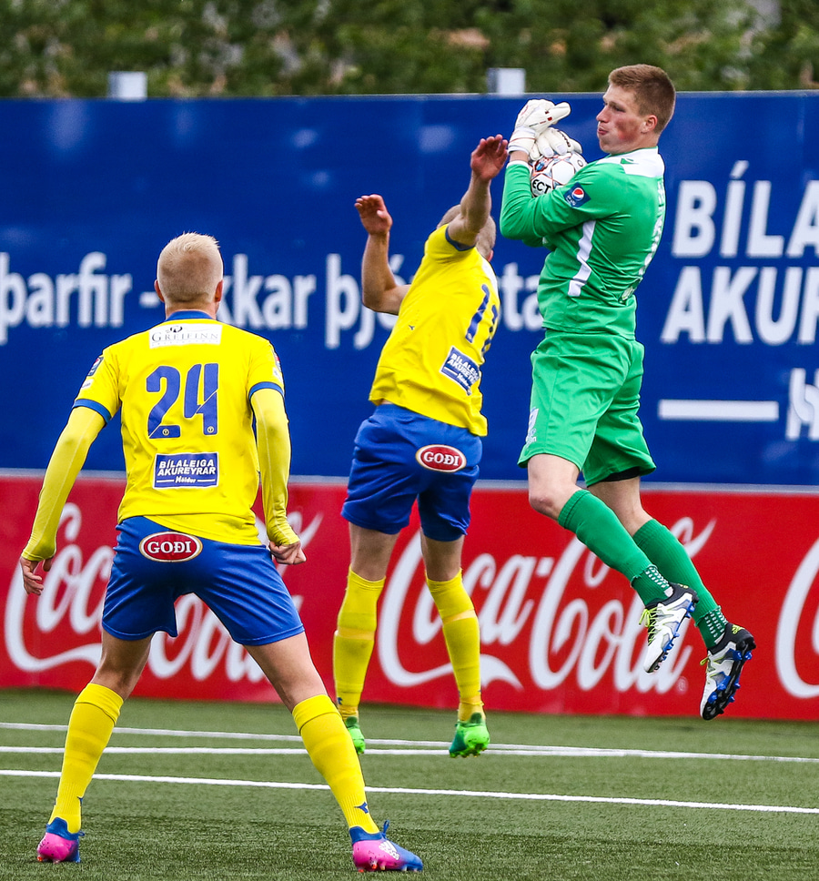 Anton Ari í basli með bolta frá vinstri hjá KA. Gestirnir fá horn. Boltinn rann úr höndunum og yfir markið.