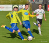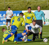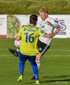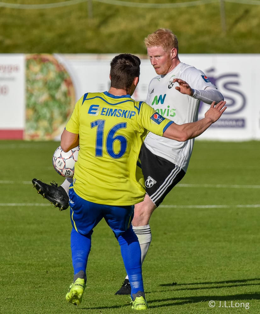 Pétur Viðarsson og René Joensen ýta í hvorn annan þegar boltinn er víðsfjarri. Ívar Orri mætir á svæðið og róar menn niður.