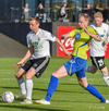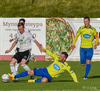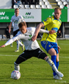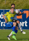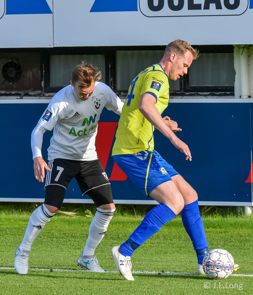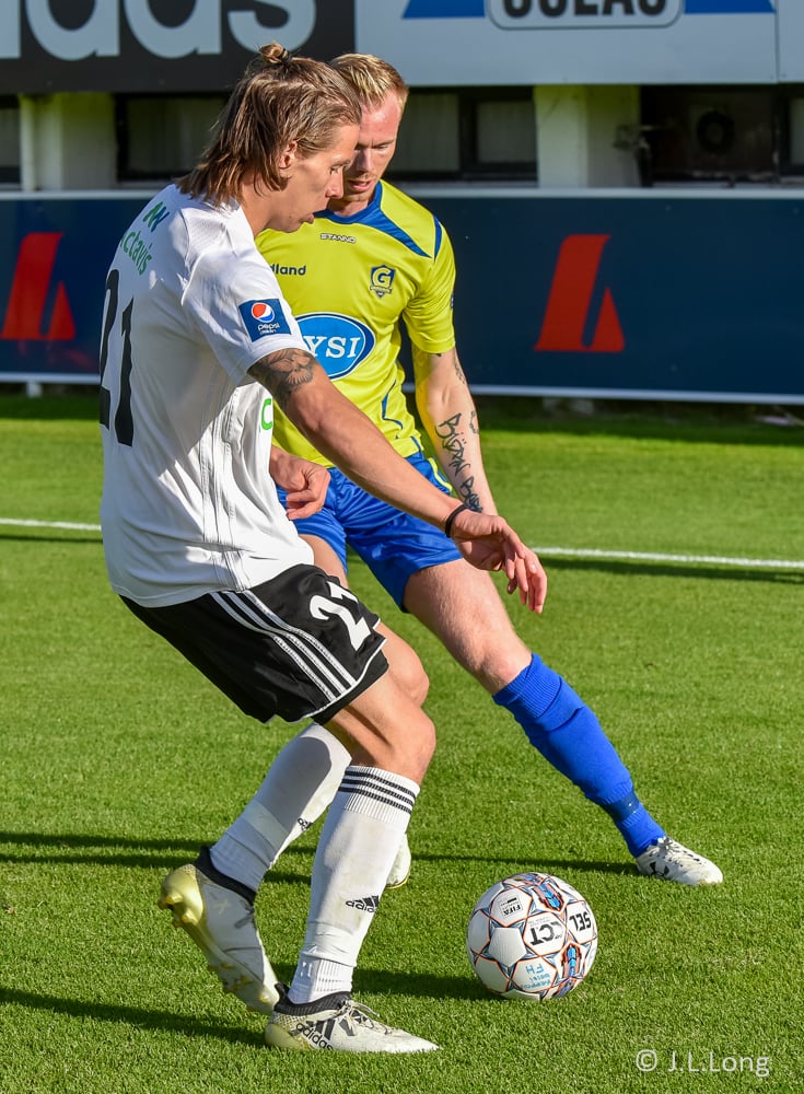 Gömlu liðsfélagarnir Steven Lennon og Sam Hewson fara í eina alvöru breska tæklingu á miðjunni. Boltinn á milli. Þeir spiluðu saman bæði hjá Fram og FH.