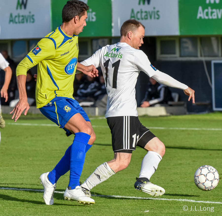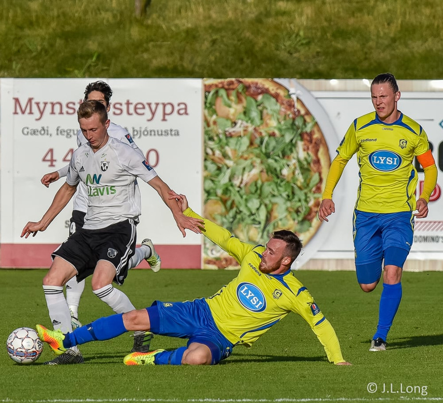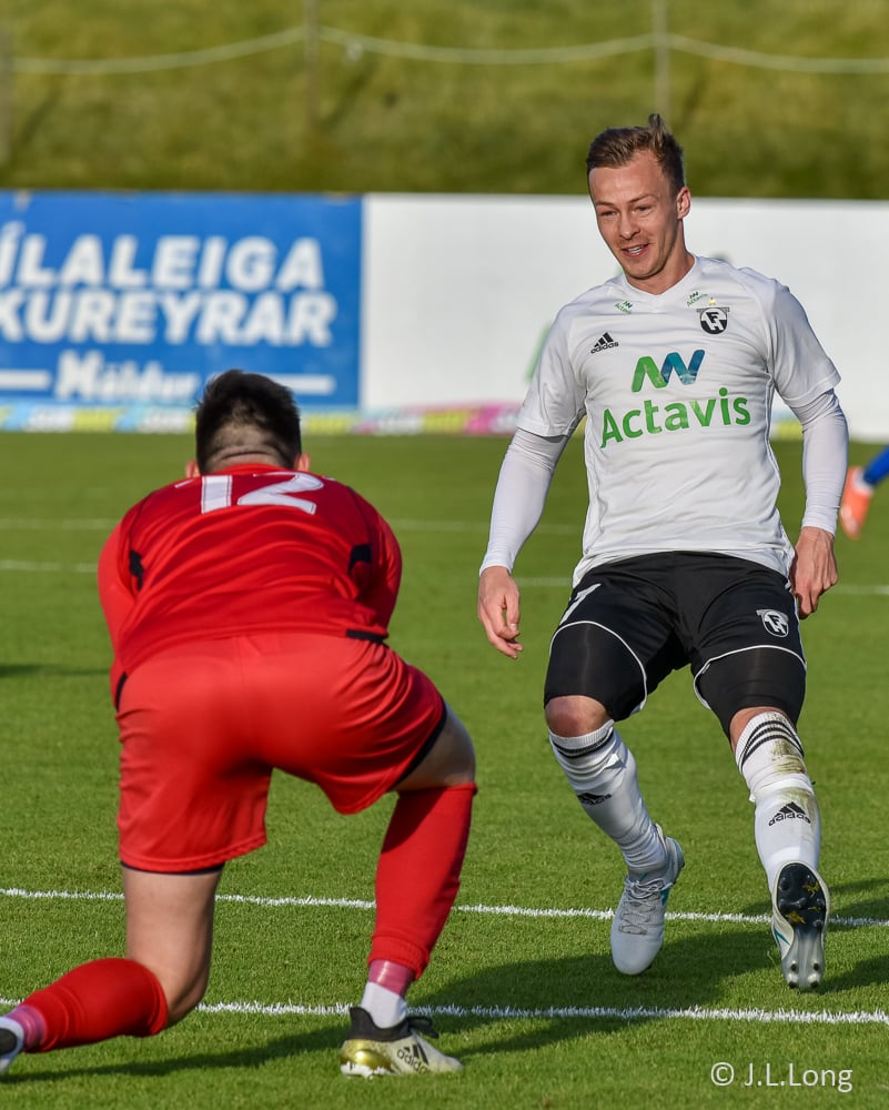 Fer aftan í Gunnar Þorsteins sem var á hörkuspretti upp vinstri kantinn.