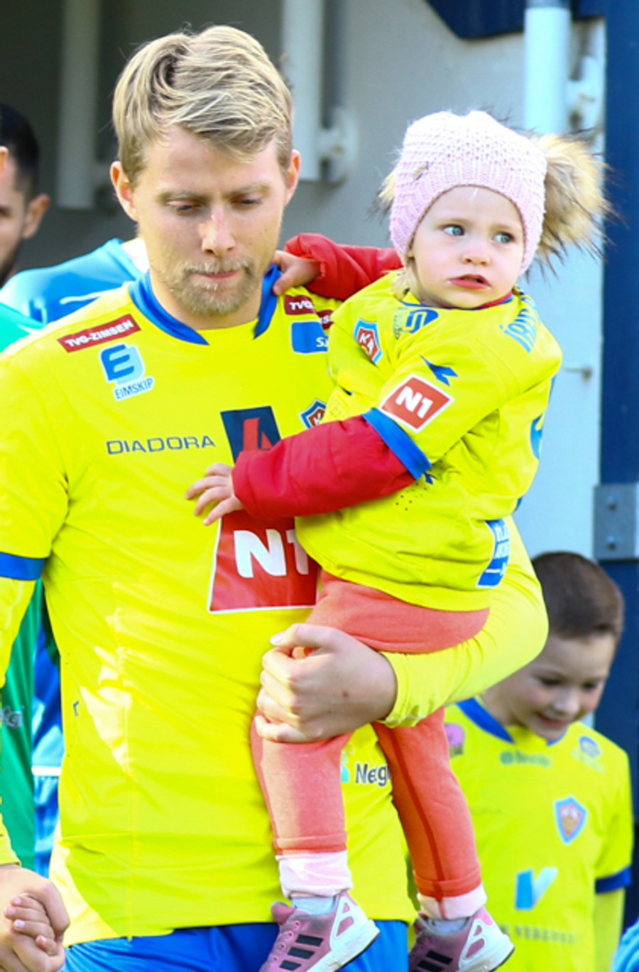 Liðin ganga hér inn til vallar! Guðmann Þórisson og Gunnar Þorsteinsson fyrirliðar eru fremstir í flokki.