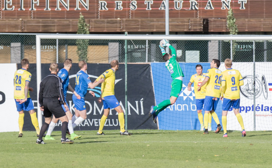 Alexander Veigar á hér fyrirgjöf sem lendir ofan á þverslánni. Rajko full rólegur þarna að mínu mati en líklega var hann með þetta á hreinu.