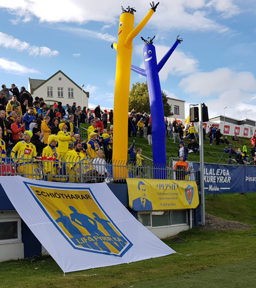 Nú eru 10 mínútur til leiks og liðin eru farin inn til búningsherbergja að græja sig. Veðrið á Akureyri er ágætt, fyrir utan frekar sterkan sunnanvind. Vonum að það hafi ekki áhrif á gæði leiksins.