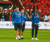 Strákarnir okkar mættir út á völl að rölta um og skoða aðstæður. Baulað hressilega á þá. Fólk er veifandi tyrkneskum fánum og mikið stuð.
