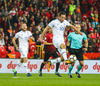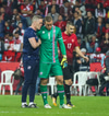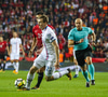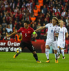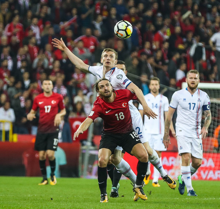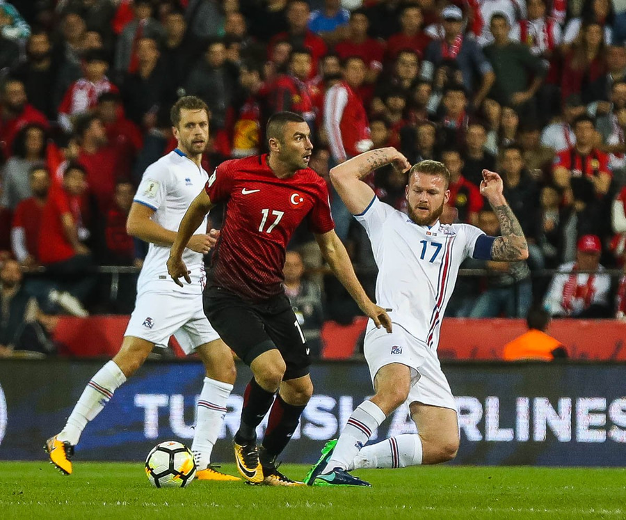 Arda Turan fær gult fyrir brot á Aroni Einari. Aron liggur á vellinum og þarf aðhlynningu.
