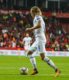 Gylfi fær skotséns, boltinn í varnarmann og afturfyrir. Horn. Darraðadans eftir hornið en Volkan nær að handsama knöttinn!