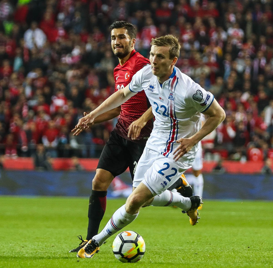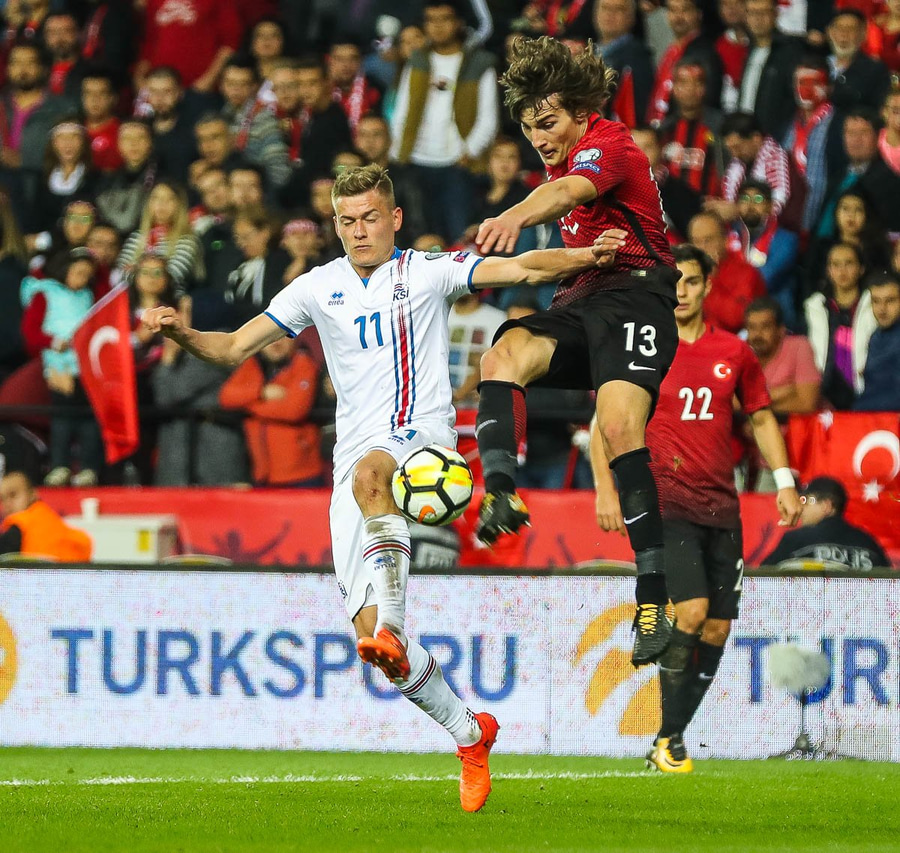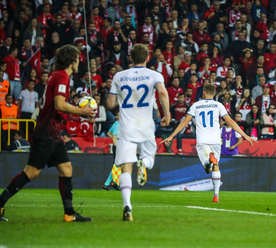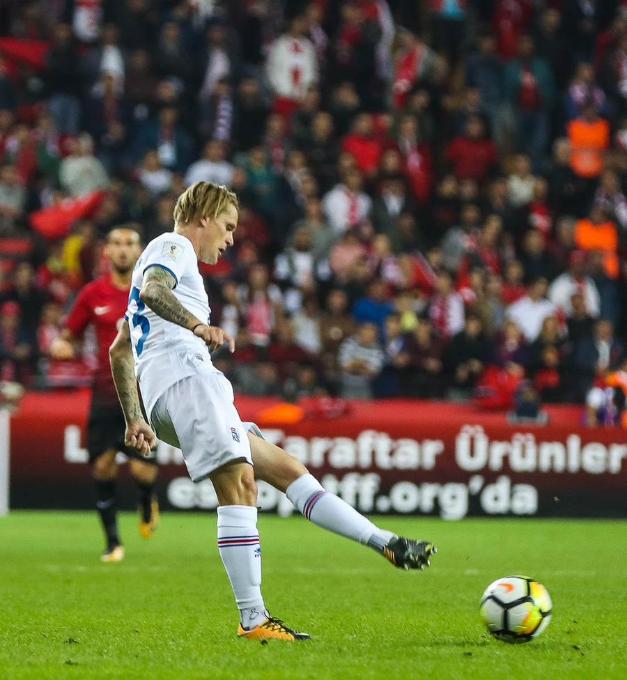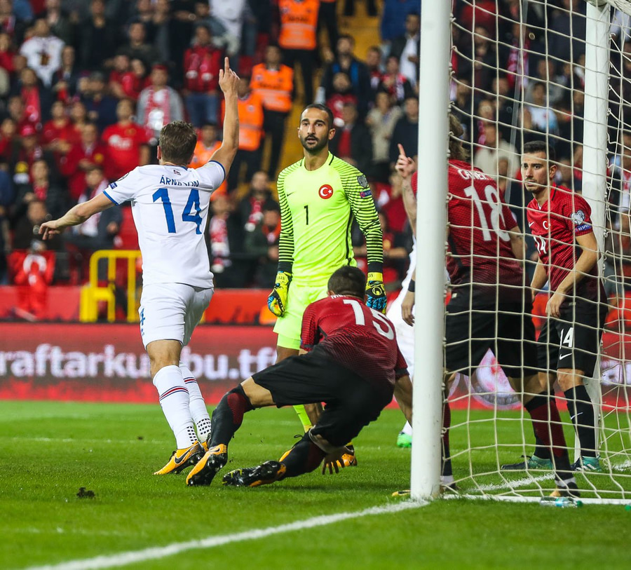 Fyrst átti Jói Berg skot sem fór í varnarmann og barst til Gylfa rétt fyrir utan teiginn. Gylfi lét vaða og náði hörkuskoti sem Volkan í marki Tyrkja rétt náði að slá yfir í hornspyrnu!
