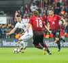 Birkir Bjarna kemst inn í teiginn vinstra meginn og á fasta sendingu með jörðinni á Jón Daða sem er aðþrengdur en skýtur í varnarmann og í horn.